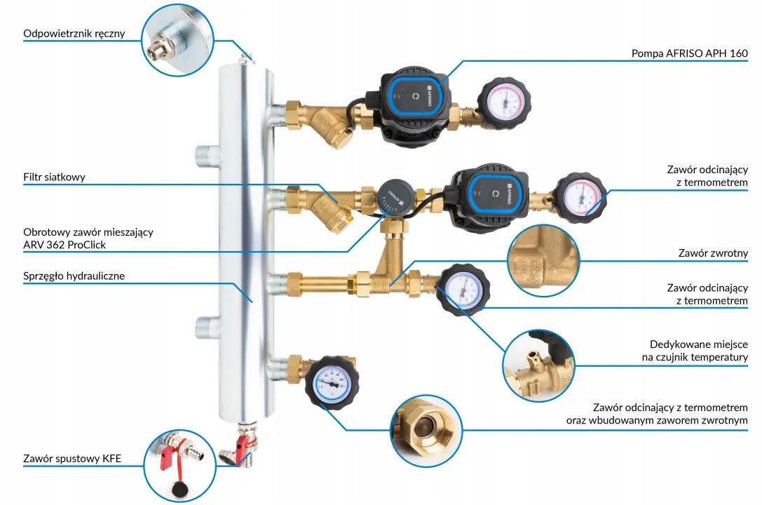 Zawory odcinające ze zintegrowanymi termometrami do kontroli temperatury medium na każdym przyłączu.