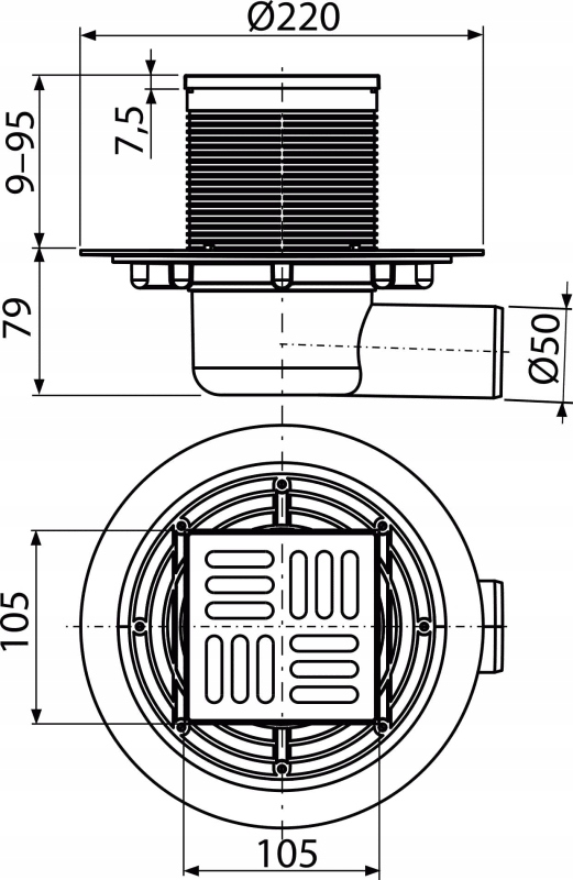 AlcaPlast Kratka ściekowa 105x105/50 mm odpływ boczny APV1321