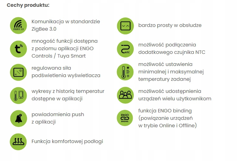 Nowatorski regulator temperatury z wbudowanym czujnikiem wilgotności. Jest połączeniem nowoczesności z precyzją działania i ciekawym designem. Cechuje go prostota instalacji i obsługi. Zarówno wersją natynkową bateryjną (wbudowany akumulator litowo-jonowy) jak i podtynkową zasilaną sieciowo (230V), można sterować bezprzewodowo za pomocą aplikacji ENGO Smart, przy użyciu bramki internetowej ZigBee 3.0 EGATEZB. Wersja podtynkowa podłączana jest przewodowo bezpośrednio do odbiornika (np. przewodowej listwy sterującej). Przeznaczony jest głównie do sterowania systemami ogrzewania podłogowego.