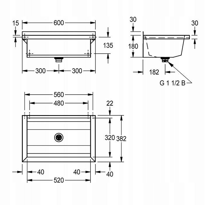 PLANOX umywalka rynnowa spawana bezspoinowo, do montażu ściennego, stal chromowo-niklowa, powierzchnia szlifowana matowa, grubość materiału: umywalki 0,8 mm / ścianek bocznych 1,2 mm. Ścianki boczne ze zintegrowanymi wspornikami ściennymi, bez półki armaturowej i bez przelewu, listwa tylna 40 mm, odpływ na środku, zawór sitkowy G 1 1/2B, w zestawie materiały montażowe.  wspornik.