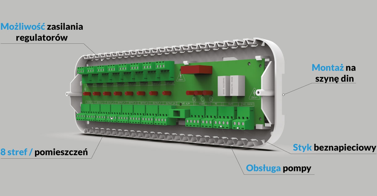 Przewodowy sterownik do podłogówki przeznaczony jest do zarządzania pracą siłowników termostatycznych na podstawie sygnału otrzymanego z regulatorów pokojowych. Kompletny zestaw urządzeń składający się z przewodowego sterownika do podłogówki, regulatorów oraz siłowników zapewni komfortową temperaturę w 8 strefach grzewczych. Urządzenie może obsłużyć maks. 50 siłowników termostatycznych przy pomocy 8 dwustanowych regulatorów pokojowych. Przewodowa listwa do podłogówki wyposażona jest także w styk beznapięciowy do zarządzania urządzeniem grzewczym.