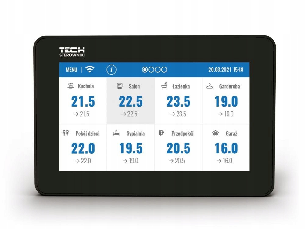 Czytelny, dotykowy panel umożliwia łatwe zarządzanie pracą podrzędnych urządzeń. Aby dokonać ustawień w podrzędnej sterownikowi strefie, wystarczy kliknąć obszar ekranu z informacją o jego stanie. Wygląd wyświetlacza panelu kontrolnego sterowników ogrzewania można dopasować do swoich potrzeb, korzystając z funkcji ustawienia ekranu. Można m.in. ustawić wygaszacz ekranu w postaci zegara albo daty. Dodatkowo użytkownik ma możliwość wyboru wersji kolorystycznej ekranu sterownika oraz włączenia lub wyłączenia dźwięku.