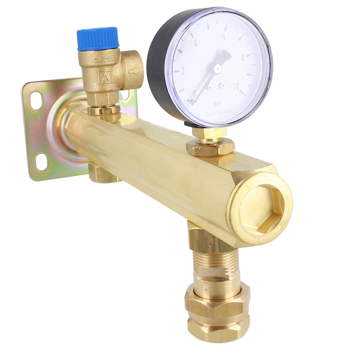 AFRISO Grupa bezpieczeństwa c.w.u. BSB, Nmax UDT 111,5 kW, z zaworem bezpieczeństwa MS 6 bar, z przyłączem do naczynia przeponowego z szybkozłączem