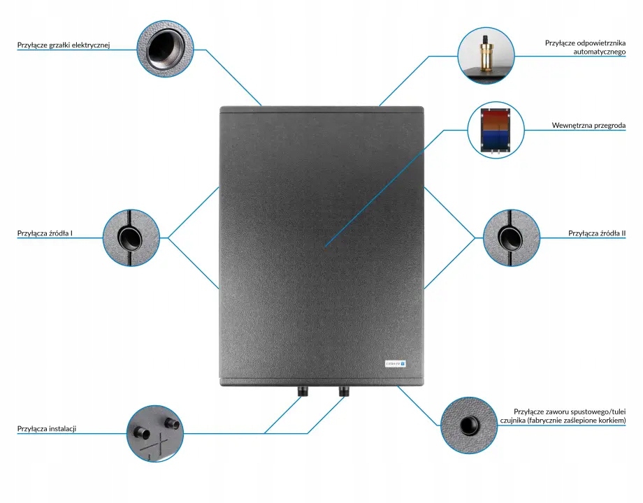 • Dedykowane przyłącza do podłączenia dwóch źródeł ciepła i grzałki elektrycznej.