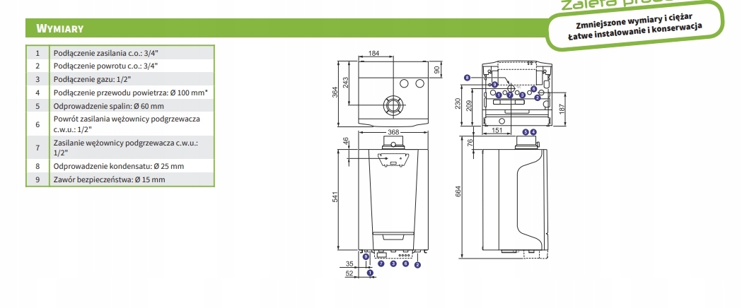 — Kocioł o nowatorskim projekcie i bardzo zwartej konstrukcji: 370 x 550 x 360 mm, o wadze zaledwie 25 kg