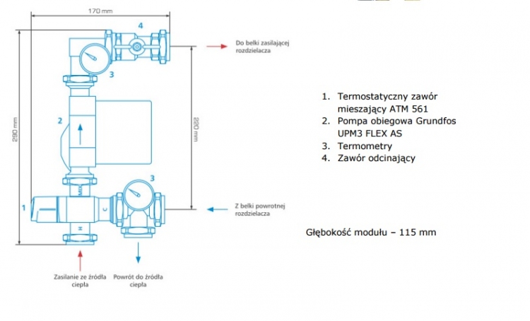 Moduł mieszający został zaprojektowany jako łącznik pomiędzy instalacją grzewczą po stronie źródła ciepła, a rozdzielaczem ogrzewania płaszczyznowego (np. podłogowego). Służy do przygotowania czynnika o odpowiedniej temperaturze, który następnie będzie tłoczony do pętli grzewczych rozdzielacza. Moduł może być wykorzystywany w połączeniu z rozdzielaczami o ilości obiegów grzewczych od 2 do 12. Wyposażony jest w zawór mieszający ATM 561 oraz pompę obiegową Grundfos UPM3 FLEX AS 15-70/130 mm.