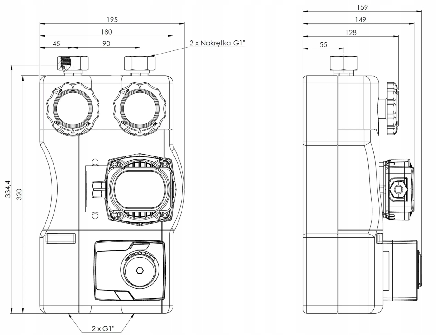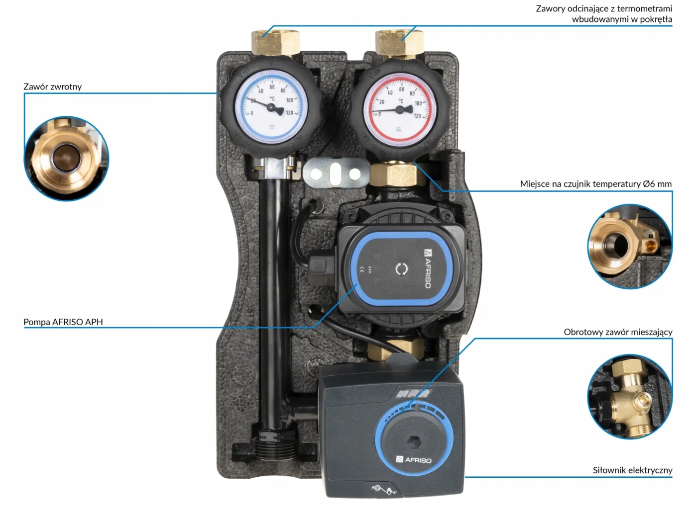 Wyposażona w niezbędne komponenty: termometry, zawór zwrotny, zawory odcinające na zasilaniu i powrocie, zawór odcinający przed pompą oraz izolację termiczną.