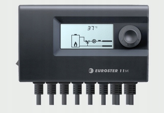 Euroster 11M to programowalny sterownik do współpracy z mieszaczem i siłownikiem oraz pompą obiegową c.o. W instalacji c.o. z kotłem węglowym sterownik automatycznie utrzymuje stałą temperaturę wody na zasilaniu lub steruje zaworem i utrzymuje stałą temperaturę wody na powrocie. Ustawienie optymalnej temperatury powrotu zapobiega zawilgoceniu kotła w trakcie rozgrzewania wody w c.o. oraz zwiększa jego żywotność. Funkcja sterownika wybierana jest programowo. W instalacji c.o. z kotłem węglowym regulator wyłącza pompę obiegową po wygaśnięciu płomienia w kotle. Euroster 11M posiada układ ochrony pompy przed zastaniem Anty Stop, który zapobiega procesowi zatarcia wirnika nieużywanej pompy. Po zakończeniu sezonu grzewczego, system co dwa tygodnie samoczynnie uruchamia pompę na 30 sekund (aby system działał po sezonie, sterownik należy pozostawić włączony).