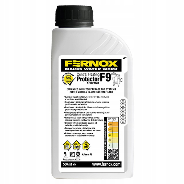 Fernox Protector+ Filter Fluid F9 jest dostępny w butelkach o pojemności 500 ml. Fernox Protector+ Filter Fluid F9 jest sklasyfikowany jako nieszkodliwy dla zdrowia ludzi, ale, tak jak w przypadku wszystkich chemikaliów, należy go przechowywać w miejscu niedostępnym dla dzieci. W przypadku kontaktu z oczami lub skórą natychmiast przemyć dużą ilością wody.