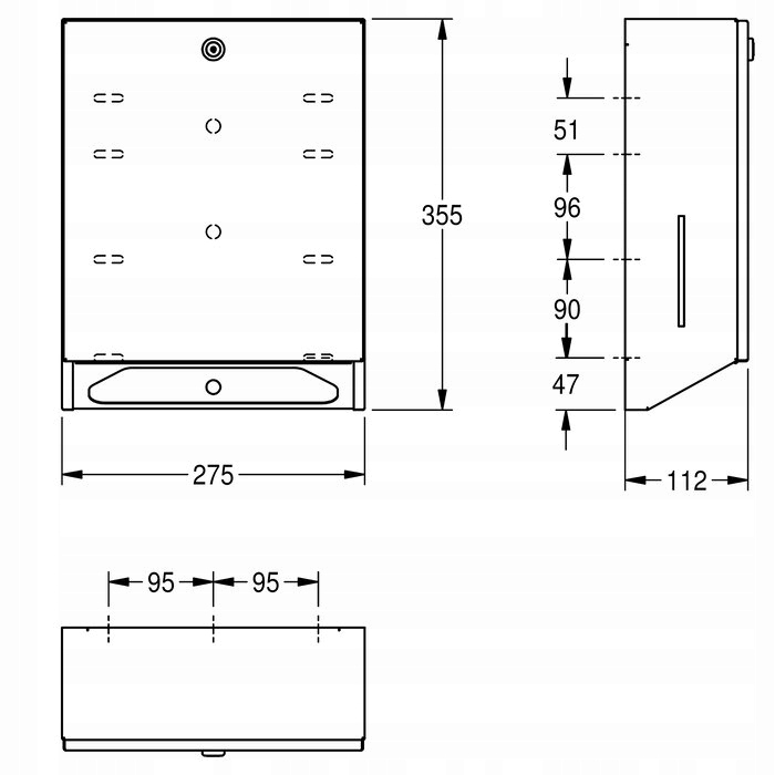 Podajnik ręczników papierowych, montaż natynkowy. Stal szlachetna, powierzchnia szlifowana matowa, grubość materiału 0,8 mm. Front o zdecydowanych, nowoczesnych wzorniczo krawędziach. Po bokach wzierniki. Zamek bębenkowy z kluczem uniwersalnym KWC. Pojemność 300 – 400 sztuk ręczników w zależności od producenta i sposobu ich złożenia. W komplecie: wkręty ze stali szlachetnej i kołki rozporowe.