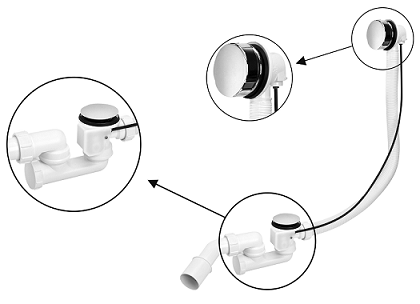 Zestaw odpływowo-przelewowy do wanny i głębokiego brodzika z pokrętłem i korkiem umożliwiającym zamknięcie i otwarcie odpływu. Pokrętło wykonane z ABS. Odejście 1.1/2″x40/50mm. Możliwość czyszczenia przez boczną rewizję.