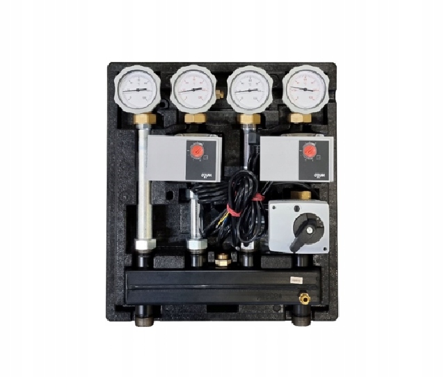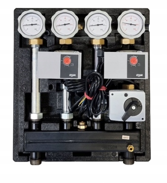 Zestaw z rozdzielaczem, opcją podłączenia czujników temperatury, zaworem zwrotnym, termometrami kontaktowymi zintegrowanymi w uchwycie na zasilaniu i powrocie, możliwość podłączenie trzeciego obwodu grzewczego np. do ładowania zbiornika lub podgrzewacza wody użytkowej.