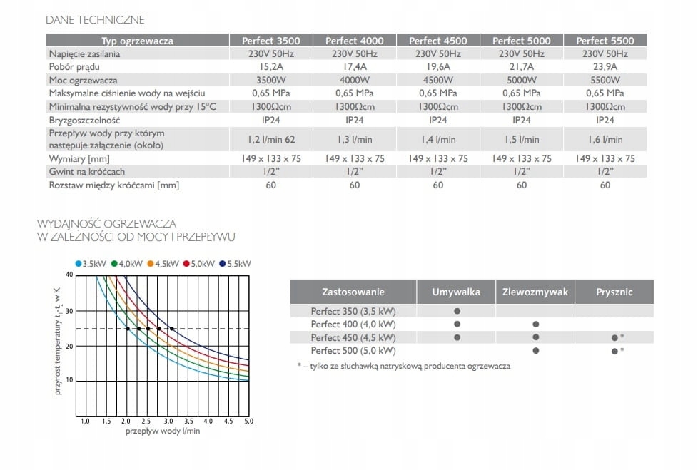 Przepływowy ogrzewacz wody serii Perfect 4000 jest ogrzewaczem ciśnieniowym o mocy 4 kW zasilanym napięciem 230V. Przeznaczony jest do zaopatrywania w ciepłą wodę jednopunktowych źródeł poboru wody, takich jak umywalka, zlewozmywak.
