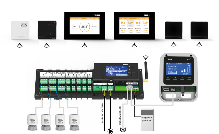 • 5 czujników pokojowych mających możliwość obsługi aż 10 siłowników (każdy max. po 2 siłowniki)