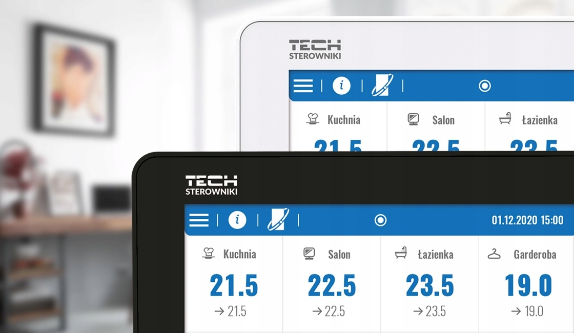 Czytelny, dotykowy panel umożliwia łatwe zarządzanie pracą podrzędnych urządzeń. Aby dokonać ustawień w podrzędnej sterownikowi strefie, wystarczy kliknąć obszar ekranu z informacją o jego stanie. Wygląd wyświetlacza panelu kontrolnego sterowników ogrzewania można dopasować do swoich potrzeb, korzystając z funkcji ustawienia ekranu. Można m.in. ustawić wygaszacz ekranu w postaci zegara albo daty. Dodatkowo użytkownik ma możliwość wyboru wersji kolorystycznej ekranu sterownika oraz włączenia lub wyłączenia dźwięku.