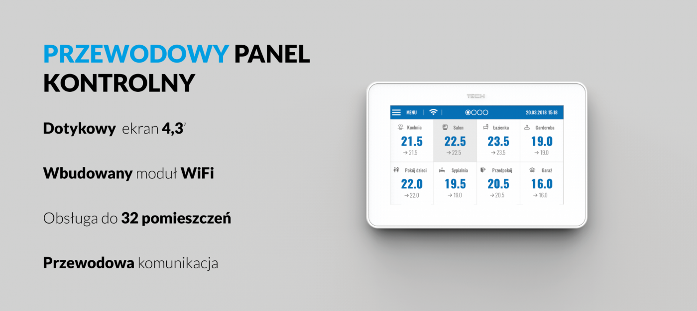 Czytelny, dotykowy panel umożliwia łatwe zarządzanie pracą podrzędnych urządzeń. Aby dokonać ustawień w podrzędnej sterownikowi strefie, wystarczy kliknąć obszar ekranu z informacją o jego stanie. Wygląd wyświetlacza panelu kontrolnego sterowników ogrzewania można dopasować do swoich potrzeb, korzystając z funkcji ustawienia ekranu. Można m.in. ustawić wygaszacz ekranu w postaci zegara albo daty. Dodatkowo użytkownik ma możliwość wyboru wersji kolorystycznej ekranu sterownika oraz włączenia lub wyłączenia dźwięku klawiszy.