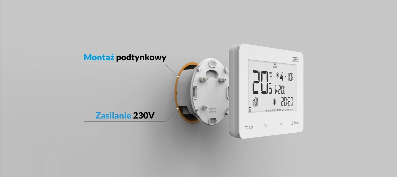 Przewodowy regulator pokojowy dwustanowy podtynkowy zasilany 230V.