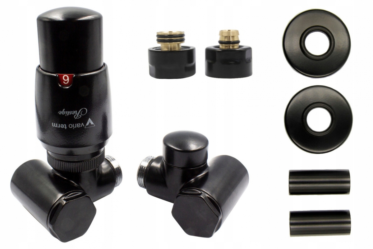 W zestawie: 1 x głowica termostatyczna "Prestige", 1 x zawór termostatyczny lewy , 1 x zawór odcinający prawy, 2 x rozeta maskująca pojedyncza , 2 x tuleja maskująca, 2 x adaptery na PEX