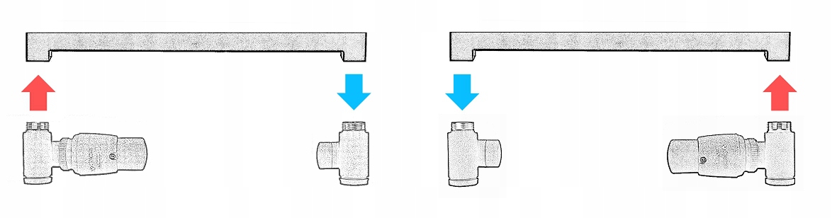 b) gdy zasilanie jest z prawej strony - wybierz zawór termostatyczny Integra prawy z rozetami pojedynczymi