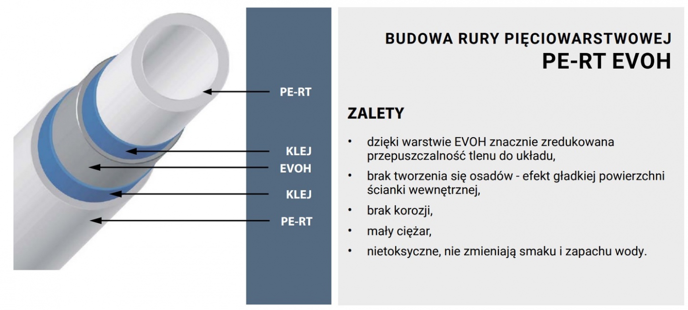 Rura PERT/EVOH/PERT jest wytworzona z polietylenu o zwiększonej odporności na temperaturę. Warstwa EVOH (bariera antydyfuzyjna) znajduje się pomiędzy wewnętrzną a zewnętrzną warstwą PE-RT. Rura PERT/EVOH/PERT jest produkowana zgodnie z normą PN-EN ISO 22391-2. Możliwość łączenia rury za pomocą złączek skręcanych i zaprasowywanych.