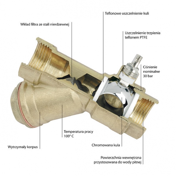 FERRO Zawór kulowy wodny 1 cal , z dławikiem i filtrem skośnym