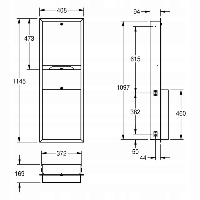 Zestaw: podajnik ręczników papierowych i pojemnik na odpady, montaż podtynkowy. Stal szlachetna, powierzchnia szlifowana matowa, grubość materiału 0,8 mm. Front o zdecydowanych, nowoczesnych wzorniczo krawędziach. Zamki bębenkowe z kluczami uniwersalnymi KWC w obu częściach. Pojemność podajnika ręczników 500 – 800 sztuk w zależności od producenta i sposobu złożenia. Pojemność pojemnika na odpady ok. 23 litry. W komplecie: wkręty ze stali szlachetnej i kołki rozporowe.