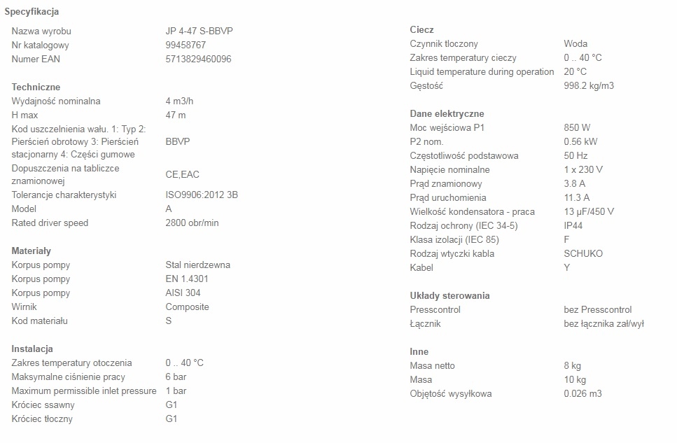 Grundfos JP 4-47 S-BBVP jest samozasysającą jednostopniową pompą z wlotem osiowym i wylotem promieniowym którą łatwo można podłączyc do wszystkich systemów instalacyjnych.Pompa JP idealnie nadaje się do tłoczenia wody ze studni i zbiorników dzięki bardzo dobrej zdolności do samozasysania.