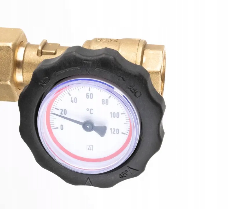 Zawór zwrotny wbudowany w zawór odcinający z niebieskim termometrem.