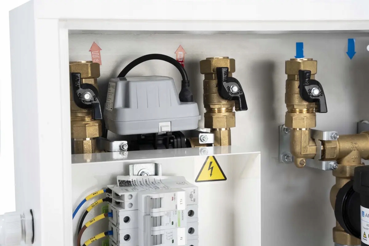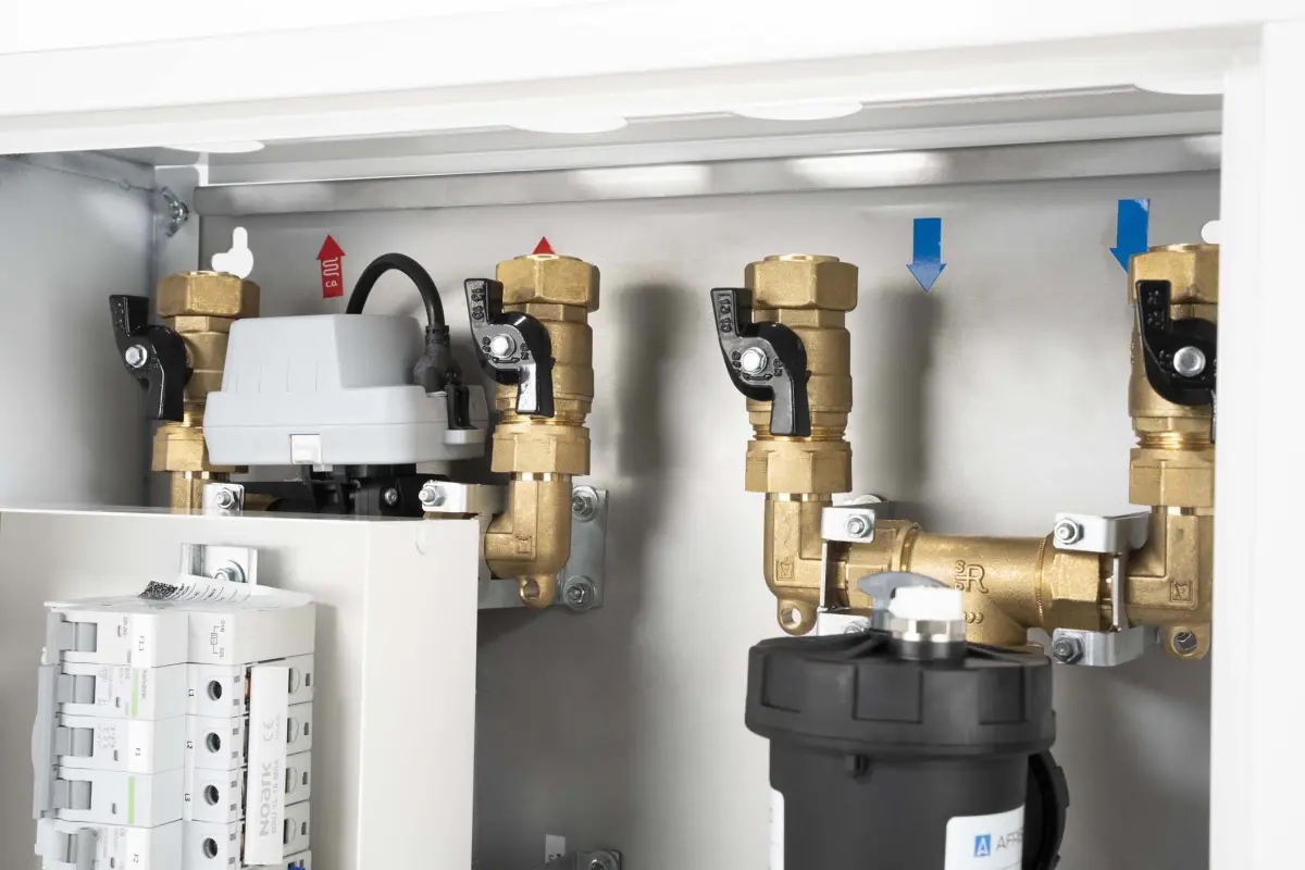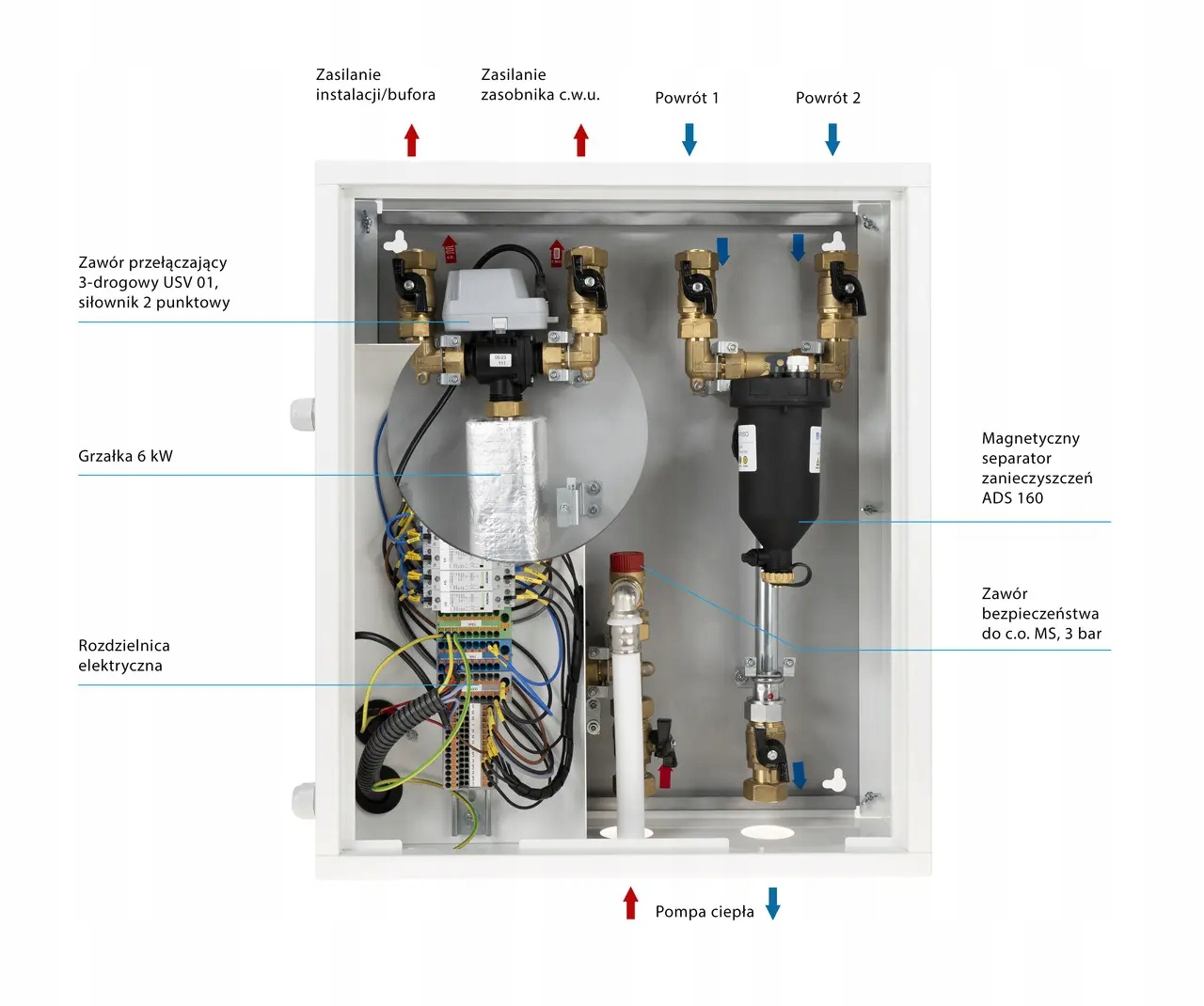 Montowany na ścianie we wnętrzu budynku pomiędzy pompą ciepła, a zasobnikiem c.w.u. i buforem/instalacją.