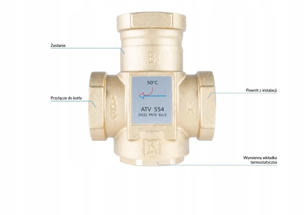 Zawór temperaturowy ATV 554, DN32, Rp1 1/4", kvs 9, 50°C