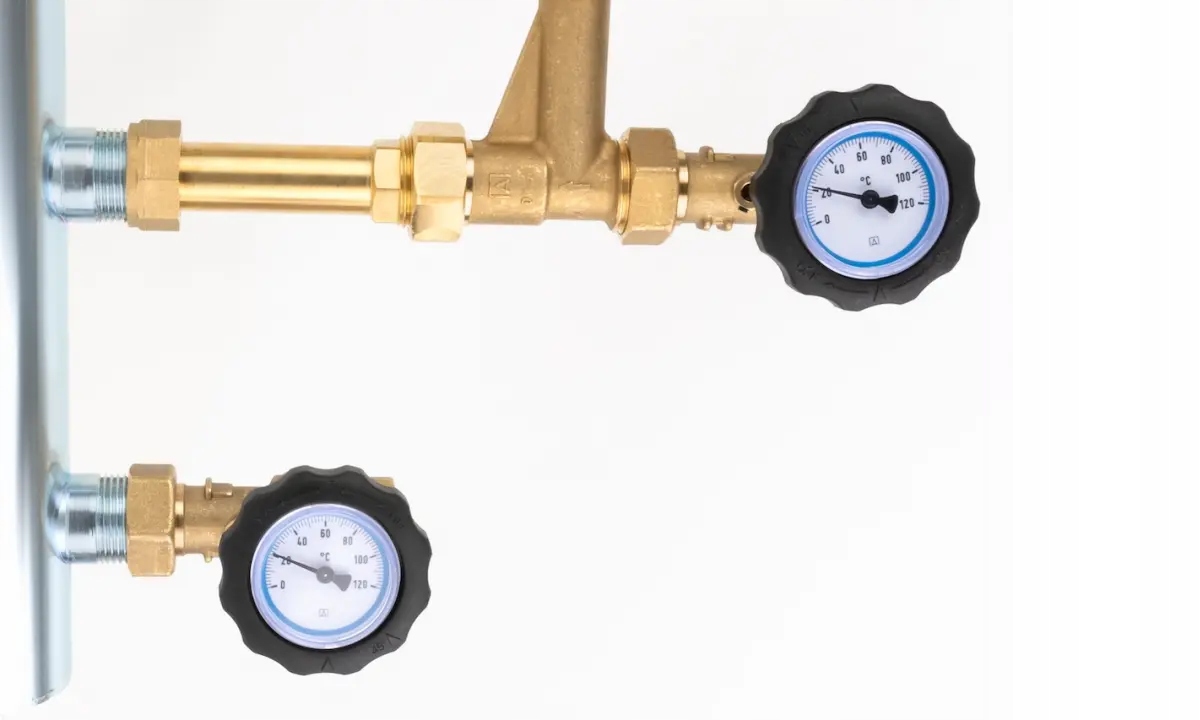 Zawory odcinające ze zintegrowanymi termometrami do kontroli temperatury medium na każdym przyłączu.