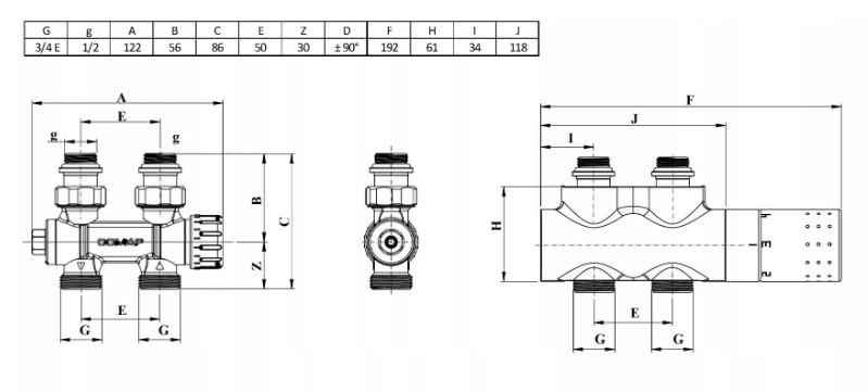 OPIS Moduł termostatyczny grzejnikowy przeznaczony do instalacji dwururowej. Podłączenie zaworu od strony instalacji za pomocą złączek typu Eurokonus 3/4", dedykowanych do rur miedzianych, stalowych i rur tworzywowych (wielowarstwowych oraz jednorodnych). Modułowa konstrukcja zaworu (4 w 1) pozwala na jego połączenie z instalacją zarówno od strony podłogi jak i ze ściany.