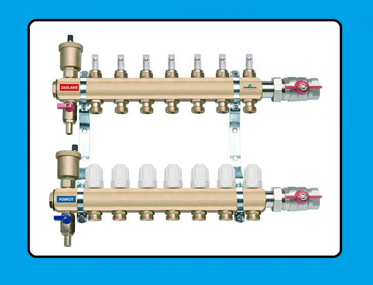 • zawory termostatyczne na belce powrotnej wyposażone w pokrętła do ręcznej regulacji z możliwością podłączenia głowicy termoelektrycznej (9)