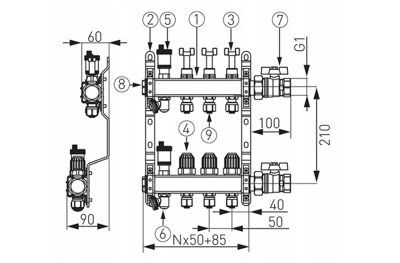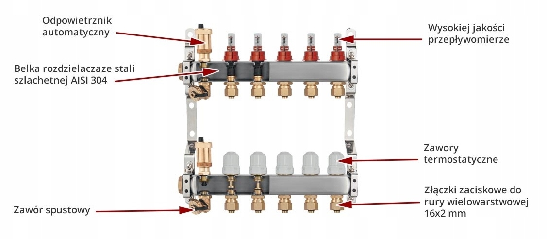 • zawory termostatyczne na belce powrotnej wyposażone w pokrętła do ręcznej regulacji z możliwością podłączenia głowicy termoelektrycznej (4)