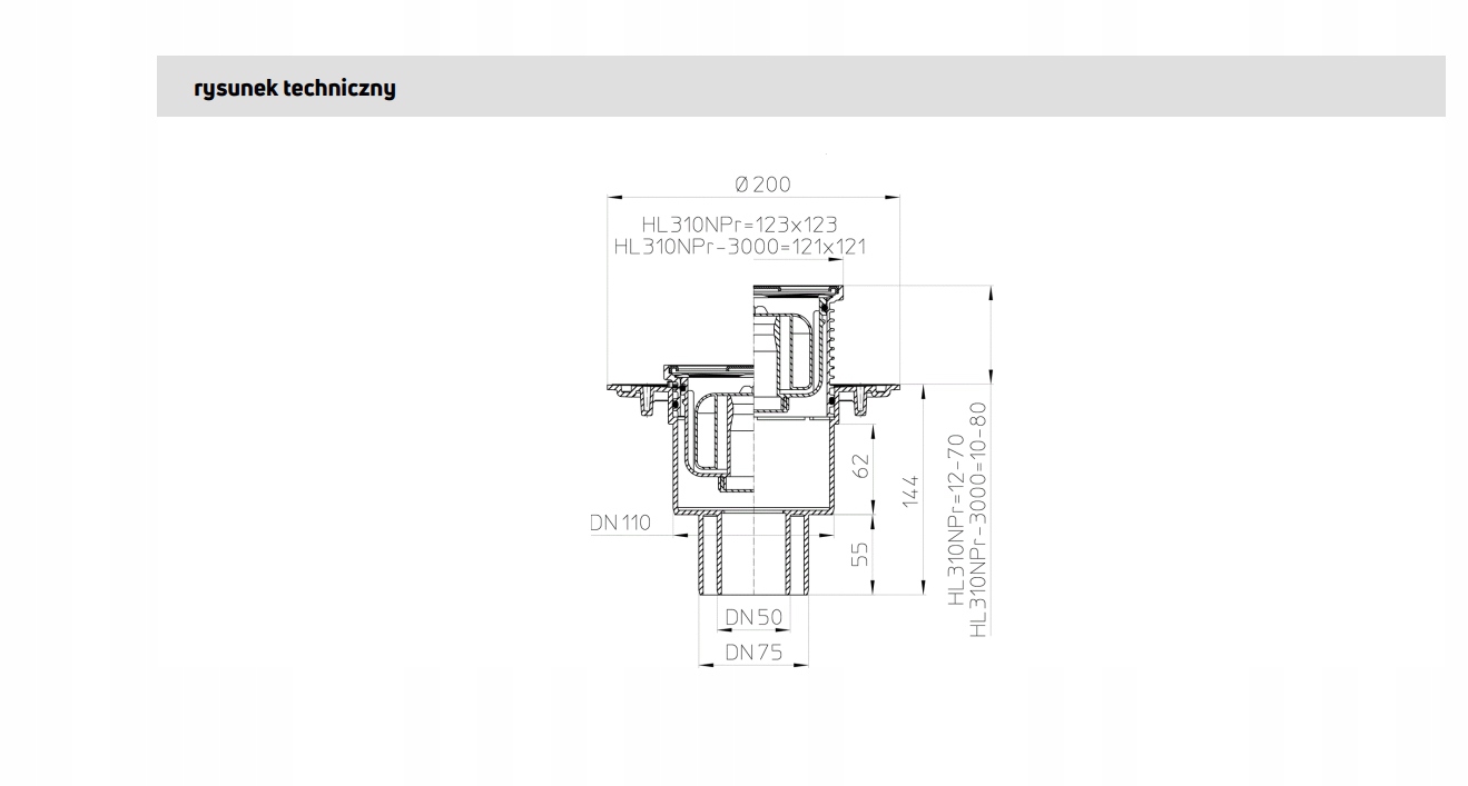 Wpust podłogowy. Kołnierz wpustu umożliwia szczelne połączenie z warstwą hydroizolacji przez użycie zestawu uszczelniającego z serii HL83. Odpływ DN50/75/110. Nasada z rusztem regulowana na wysokości przez odcięcie w zakresie 12-70mm. Wpust wyposażony w suchy syfon Primus zabezpieczający przed wydobywaniem się zapachów nawet w przypadku braku wody w syfonie. Przepływ 0,5 l/s. Odporność termiczna do 85oC. Nadbudowy proste i kołnierzowe (HL340N, HL85N, HL85NC,HL85NH) dają możliwość dostosowania odwodnienia do układu warstw stropu.