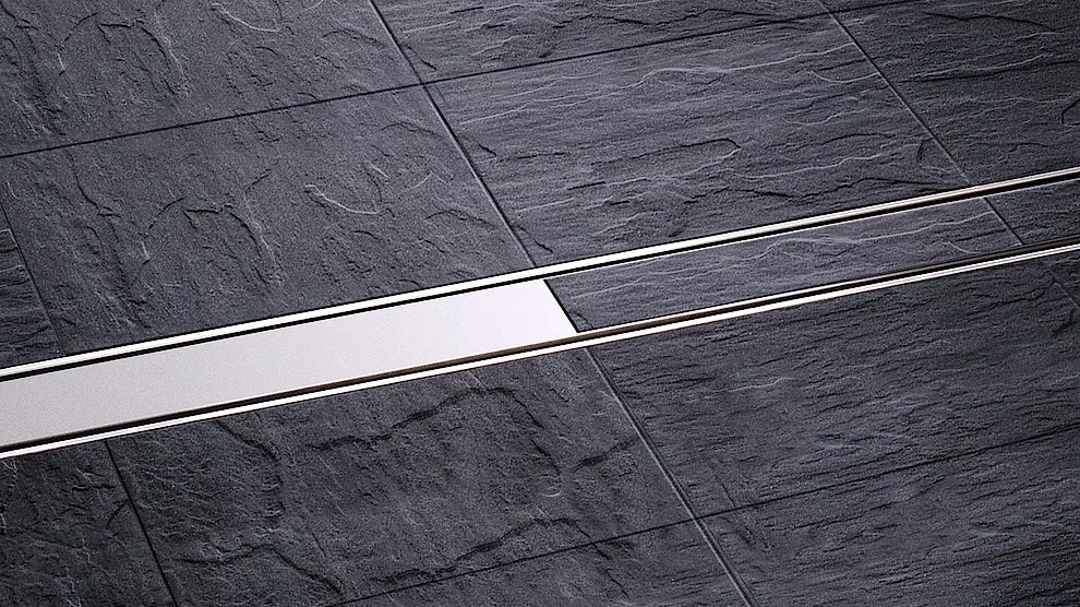 Odpływ liniowy z serii Linearis Compact z pokrywą 2w1 wykonaną ze stali nierdzewnej która po odwróceniu umożliwia wklejenie płytki