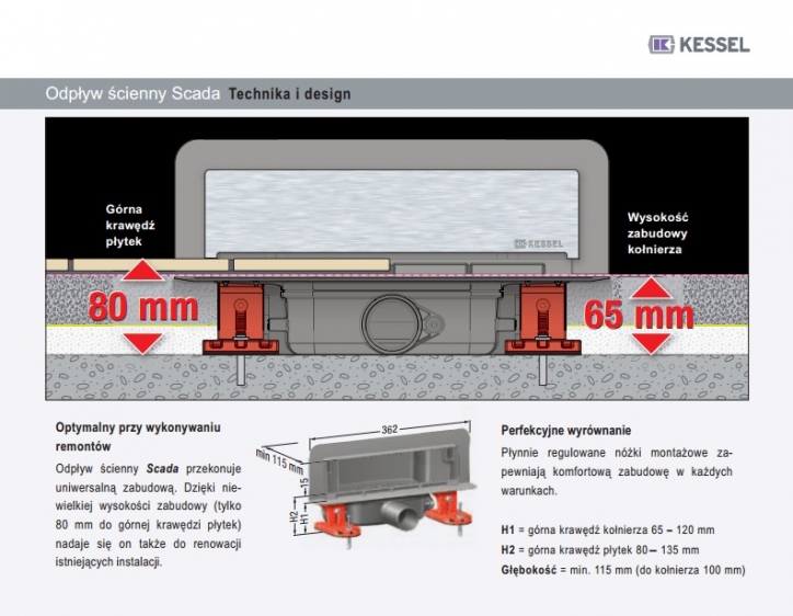 Najwyższa jakość materiału, nóżki montażowe ułatwiające zabudowę, niewielka wysokość zabudowy wynosząca 80mm do krawędzi płytki gwarantują pewną zabudowę zarówno w nowych budynkach jak i podczas renowacji istniejących instalacji.