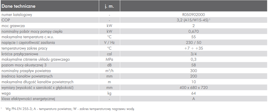 • Wartość współczynnika COP: 3,2 (A15/W15-45) zgodnie z normą PN-EN 255-3 (A - temp. powietrza; W - zakres temperaturowy nagrzewu wody).
