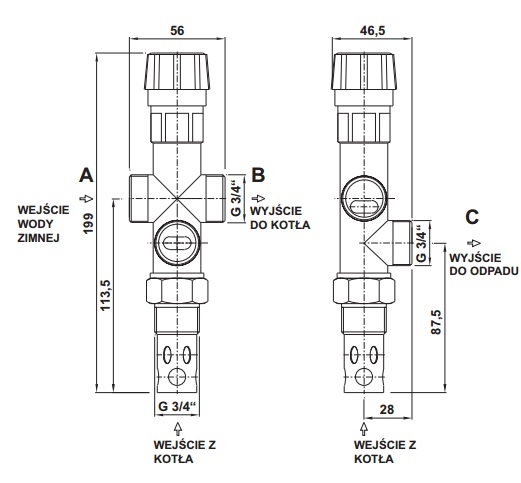 Instalacji może dokonać wyłącznie osoba do tego przeszkolona. Dla sprawnego funkcjonowania dwudrożnego termostatycznego zaworu bezpieczeństwa ( dalej zwany DVB) konieczne jest zachowanie przewidzianych warunków jego instalacji oraz zachowanie kierunku przepływu oznaczonego na korpusie zaworu. Zawór bezpieczeństwa montuje się zawsze na wyjściu gorącej wody lub bezpośrednio na kotle w jego górnej części, gdzie ogrzana woda jest wyprowadzana systemu grzewczego. Podczas instalacji zaworu DBV należy sprawdzić czy użyte gniazdo ¾“ , czy to na rurze czy na kotle, umożliwi pełne zanurzenie termostatycznej części zaworu. Po zamontowaniu zaworu w gwincie ¾“ należy do miejsca „C“ (patrz rysunek ), podłączyć rurę odpływową, którą będzie wypuszczana gorąca woda z kotła. Do miejsca „A“ należy podłączyć wejście zimnej wody, która po załączeniu się zaworu doprowadzi wodę chłodzącą kocioł. Na wejściu zimnej wody należy zamontować filtr chroniący zawór przed zanieczyszczeniem. Do miejsca „B“ przyłącza się rurę, która będzie podłączona do powrotu wody z systemu ogrzewania w pobliżu kotła.
