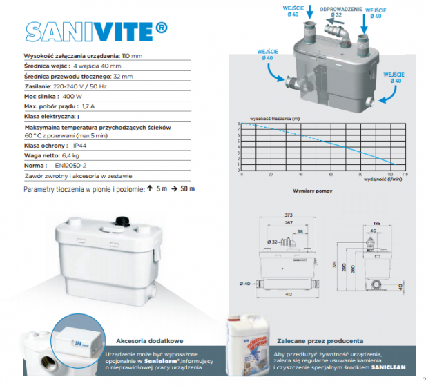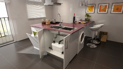 Pompa przeznaczona do pracy w kuchni lub w łazience bez toalety. Sanivite może odprowadzić ścieki na wysokość 5m. Idealny do małych pralni, przebieralni z wieloma prysznicami lub kompletnej kuchni ze zlewozmywakiem, zmywarką, pralką.