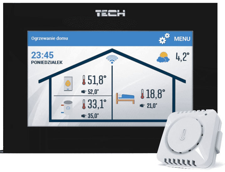 Zastosowanie regulatora pokojowego zapewnia inteligentne utrzymywanie zadanej temperatury pomieszczenia poprzez automatyczne proporcjonalne regulowanie zadanej temperatury kotła. Regulator ma możliwość dostosowywania przez użytkownika parametrów algorytmu sterowania. Urządzenie jest kompatybilne z protokołem OpenTherm/ plus (OT+) i OpenTherm/lite (OT-). Duży, czytelny, kolorowy wyświetlacz dotykowy pozwala na bardzo wygodną obsługę regulatora i modulację jego parametrów. Łatwy montaż na ścianie, estetyka urządzenia, przedni panel dotykowy, a także jego niewygórowana cena stanowią kolejne zalety regulatora. Komunikacja WiFi - nadzór przez aplikację e-Modul W zestawie bezprzewodowy czujnik C-mini