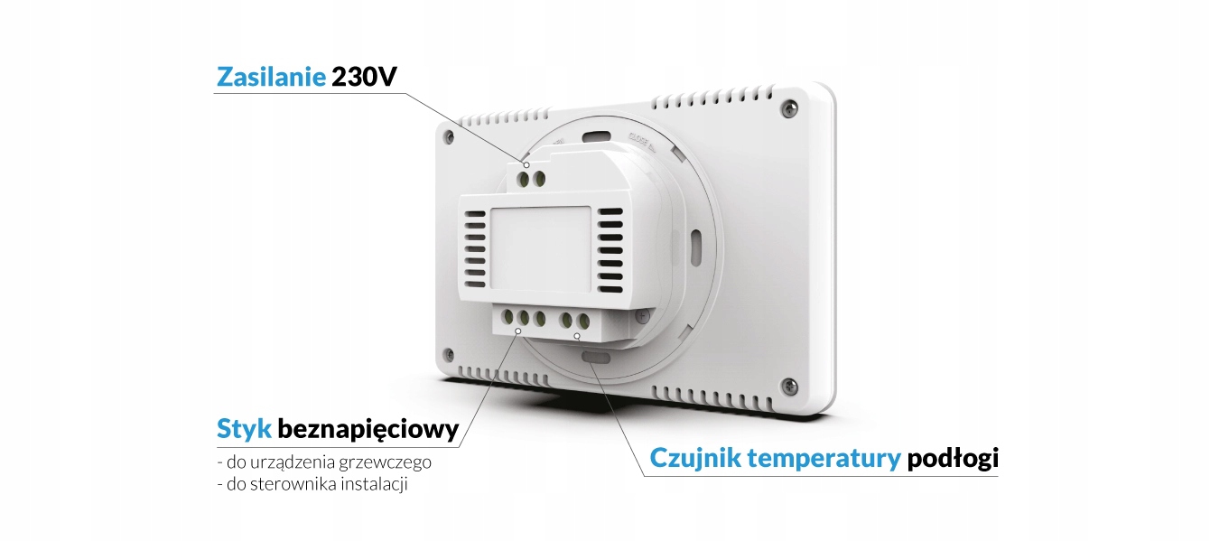 Przewodowy regulator pokojowy dwustanowy podtynkowy zasilany 230V.