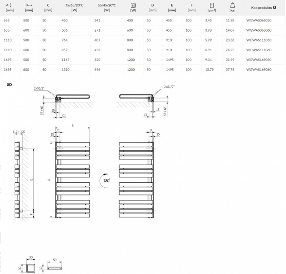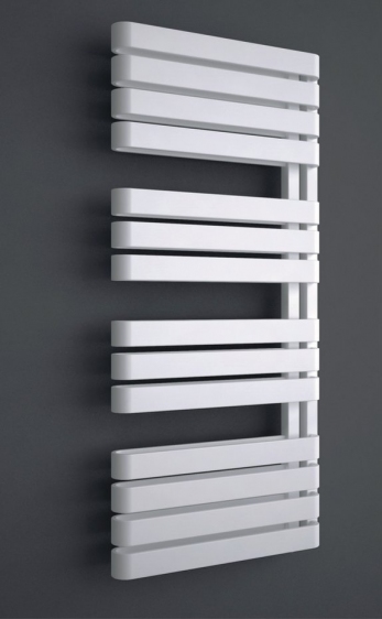 Dzięki nietypowemu, jednostronnemu umiejscowieniu kolektorów, prosty łazienkowy grzejnik nabiera zupełnie nowego wyrazu. Pomimo asymetrycznej konstrukcji bryła pozostaje wizualnie stabilna i wyważona. Duże przestrzenie pomiędzy grupami profili oraz całkiem spora moc grzewcza umożliwiają swobodne korzystanie z grzejnika jako suszarki.
