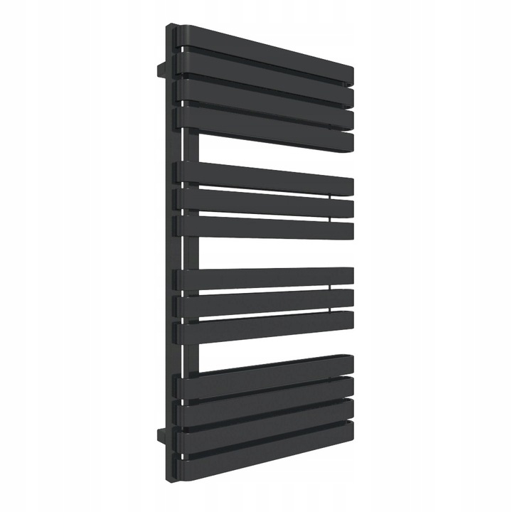 Uporządkowana asymetria Dzięki nietypowemu, jednostronnemu umiejscowieniu kolektorów, prosty łazienkowy grzejnik nabiera zupełnie nowego wyrazu. Pomimo asymetrycznej konstrukcji bryła pozostaje wizualnie stabilna i wyważona. Duże przestrzenie pomiędzy grupami profili oraz całkiem spora moc grzewcza umożliwiają swobodne korzystanie z grzejnika jako suszarki..