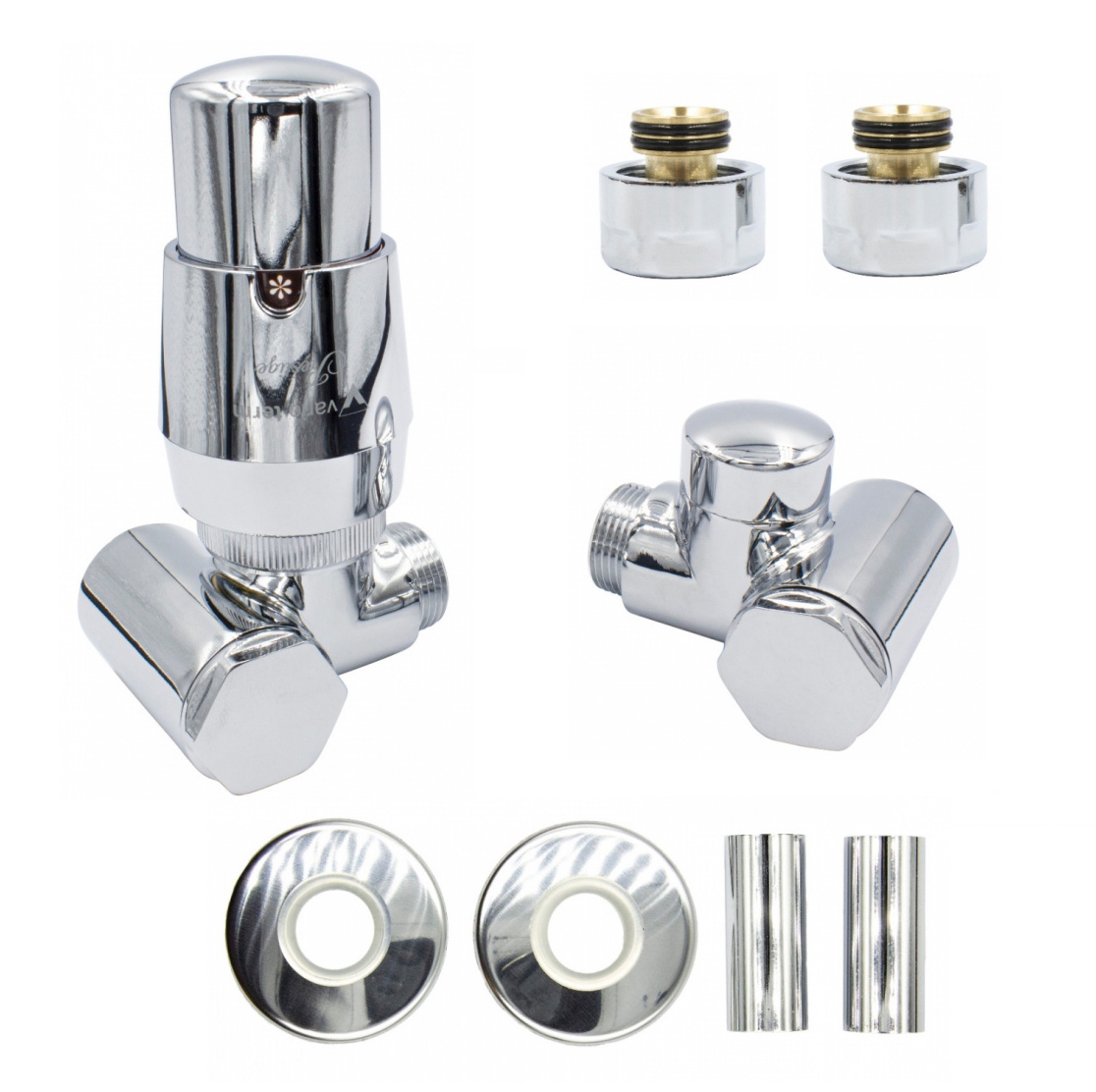 W zestawie: 1 x głowica termostatyczna "Prestige", 1 x zawór termostatyczny lewy , 1 x zawór odcinający prawy, 2 x rozeta maskująca pojedyncza , 2 x tuleja maskująca, 2 x adaptery na PEX