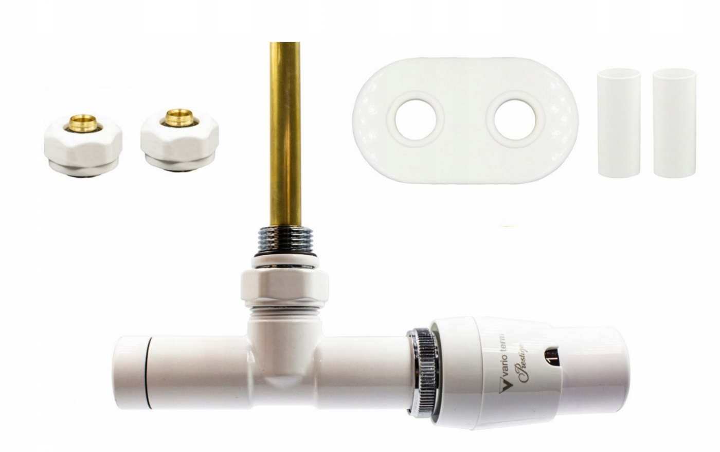 W zestawie: 1 x głowica termostatyczna "Prestige", 1 x przyłącze kątowe prawe, 1 x rurka zanurzeniowa, 1 x rozeta maskująca podwójna (okrągła lub prostokątna), 2 x tuleja maskująca, 2 x adaptery na PEX