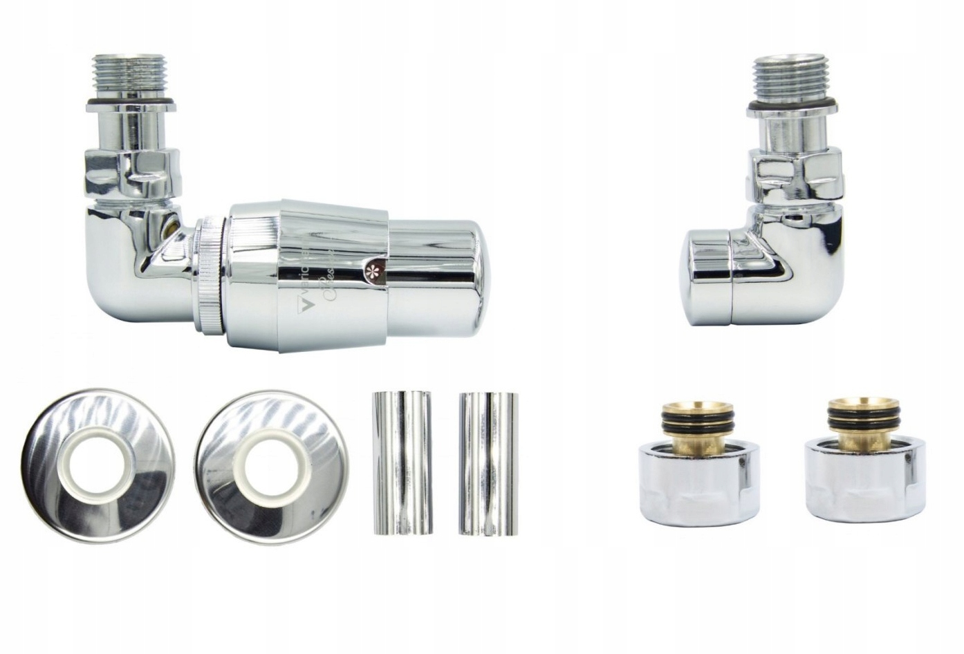 W zestawie: 1 x głowica termostatyczna "Prestige", 1 x zawór termostatyczny lewy, 1 x zawór odcinający prawy , 2 x rozeta maskująca pojedyncza *, 2 x tuleja maskująca, 2 x adaptery na PEX