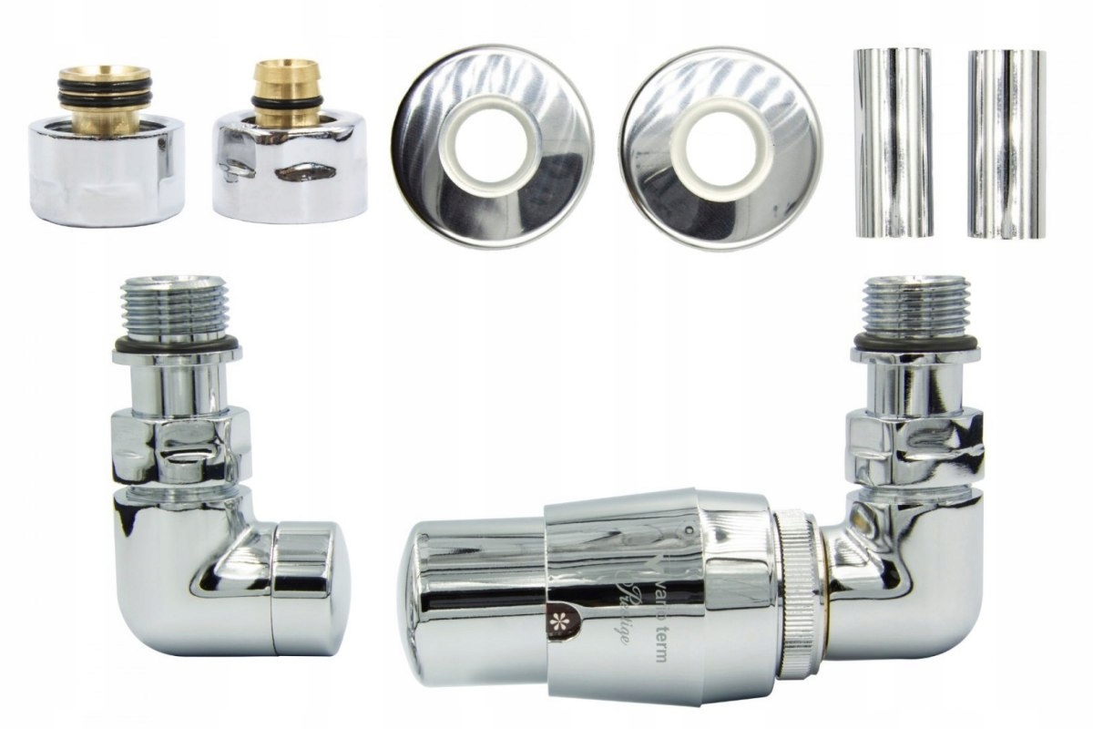 W zestawie: 1 x głowica termostatyczna "Prestige", 1 x zawór termostatyczny prawy, 1 x zawór odcinający lewy , 2 x rozeta maskująca pojedyncza *, 2 x tuleja maskująca, 2 x adaptery na PEX