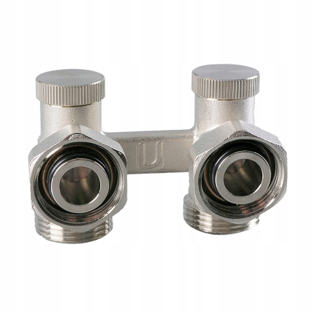 Przyłącze niklowane VK kątowe do grzejników dolnozasilanych, zawory odcinające z możliwością regulacji i równoważenia przepływu w grzejniku.