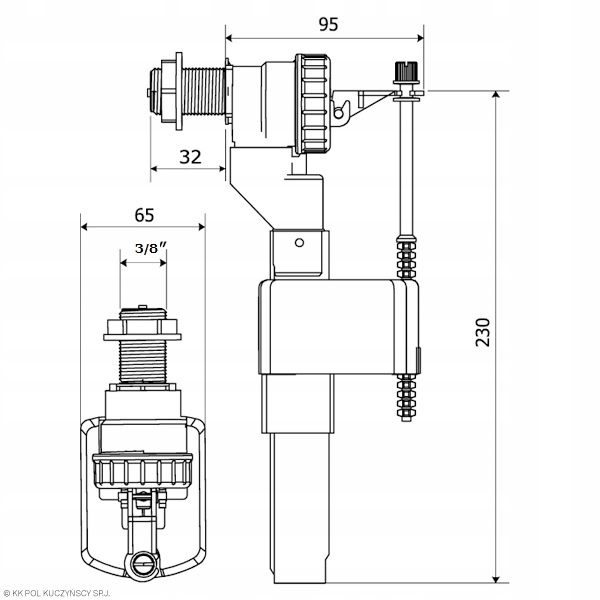 Przeznaczony do zainstalowania w zbiornikach spłukujących z otworem do montażu zaworu w bocznej ściance. Płynna regulacja poziomu napełnienia.